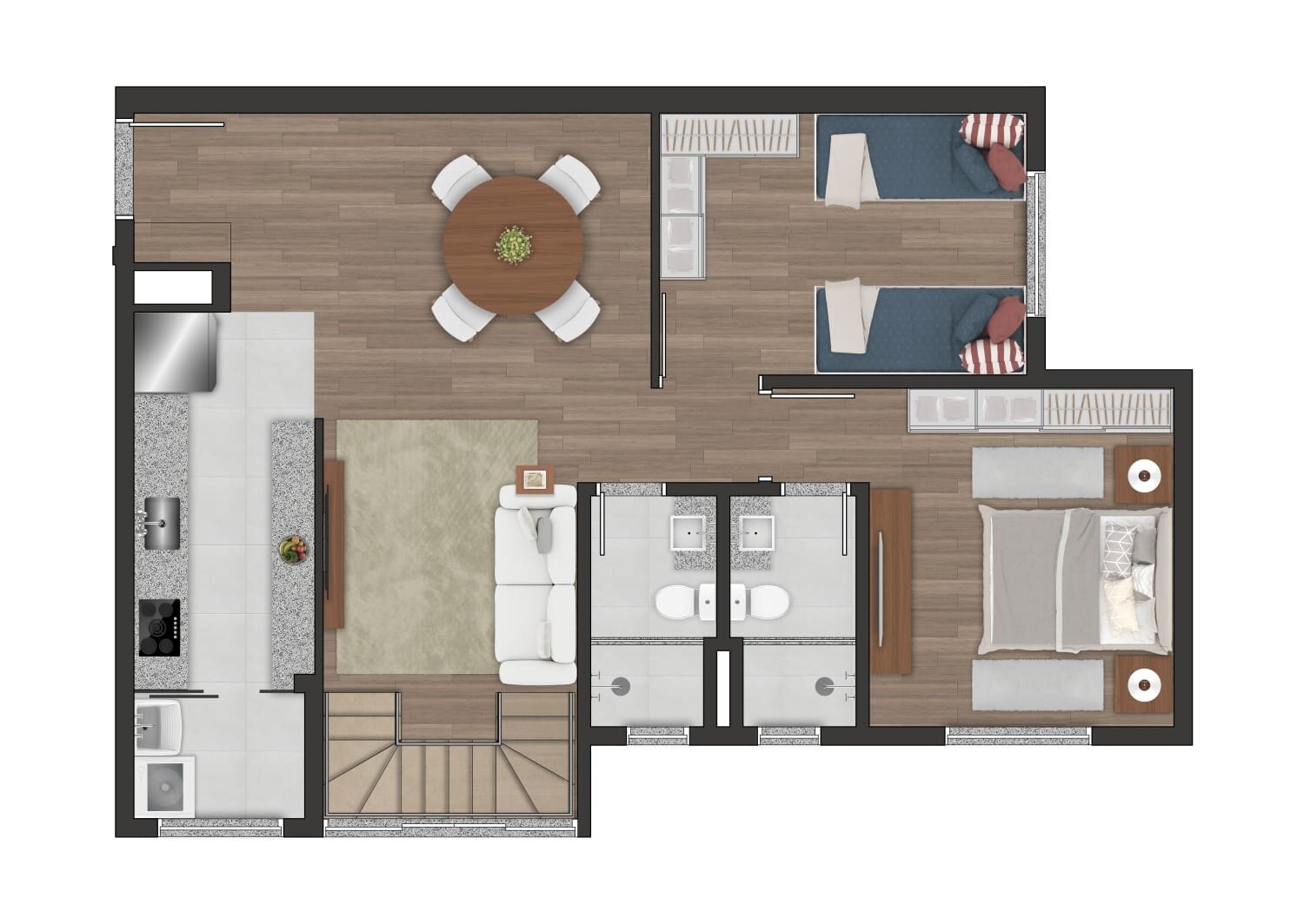 Apartamentos com 63m² | Cobertura Duplex com 122m2 – Terraço com reforço estrutural para ofurô | Cobertura 801 e 802 com duas vagas de garagem | 1 vaga de garagem para os demais apartamentos | 2 Dormitórios, sendo uma suíte | 1 Banheiro social | Churrasqueira | Sacada com acesso pela sala e lavandeira | Esquadrias de alumínio com persianas nos dormitórios | Espera para split nos dormitórios e na sala | Medidor de água e gás individualizado