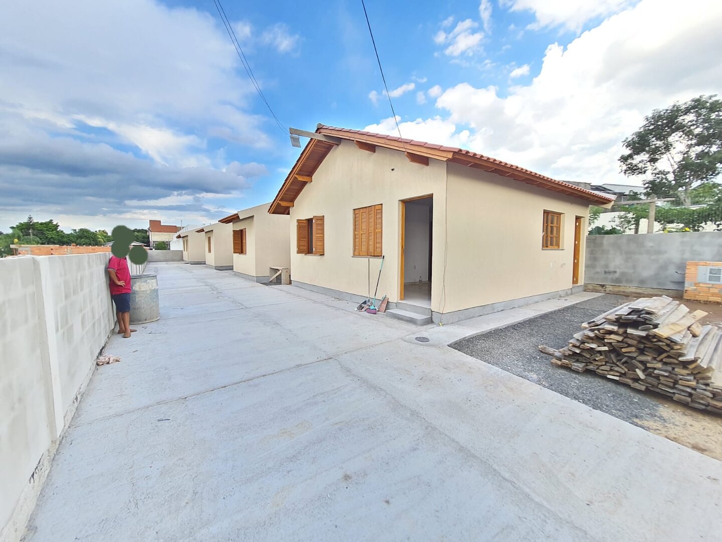 Casas totalmente individualizadas todas de frente para a rua, separadas por muros, terreno do imovel com 9,6m de frente por 12m de comprimento, com 02 dormitorios, sala e cozinha integradas, area de serviço, banheiro, garagem para 2 carros, patio na frente e nos fundos, a garagem e na lateral do imovel com acesso para o patio dos fundos.